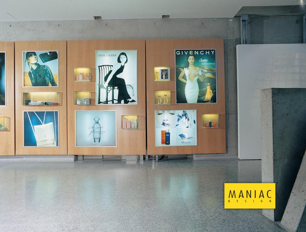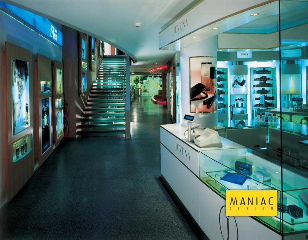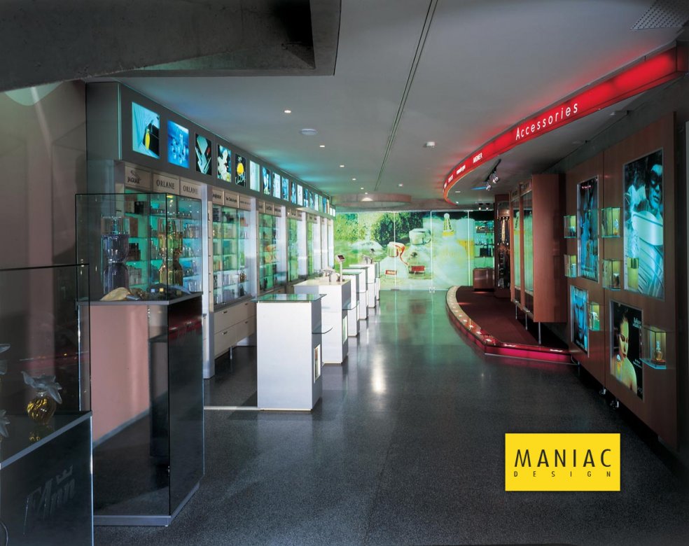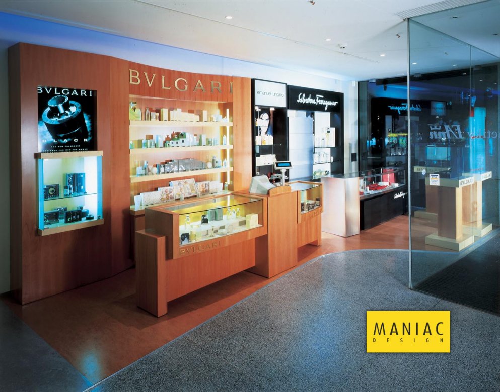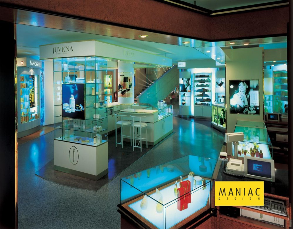 Návrh prodejních koutů respektujícíh Corporate image a Brand image jednotlivých kosmetických značek: Bvlgari, Salvatore Ferragamo, Juvena, Givenchy, Nina Rici, Chanel, La Praire a další. Realizace: Atelier S, Drkoš Interiéry, 1999