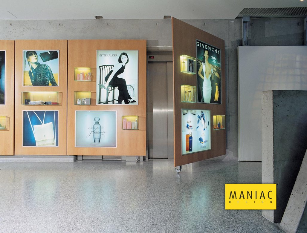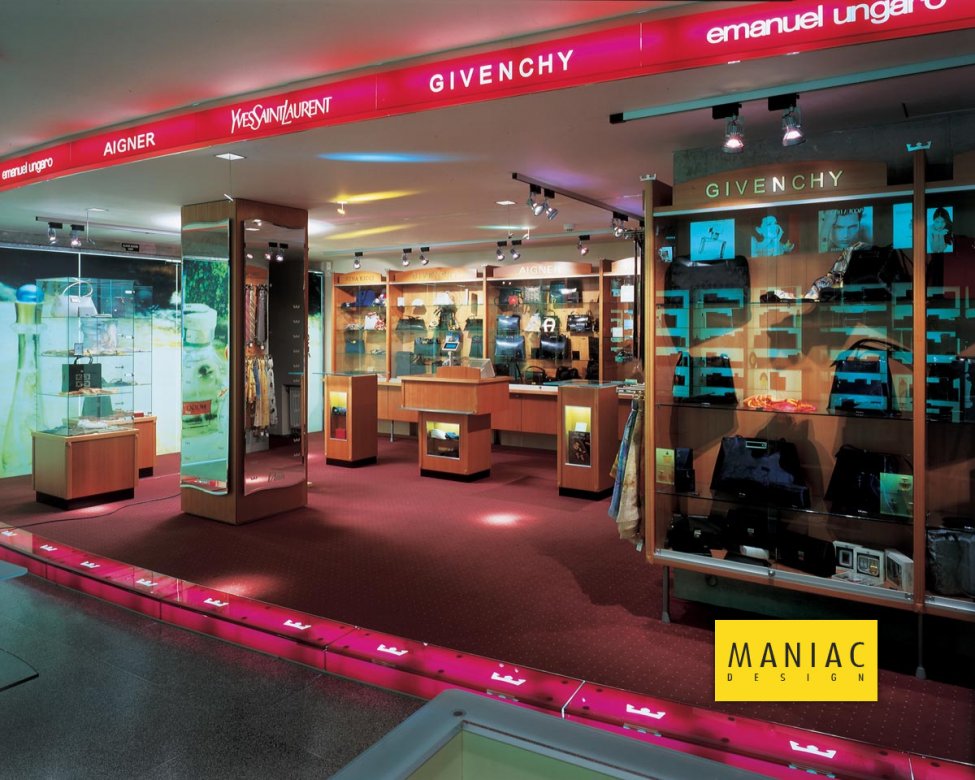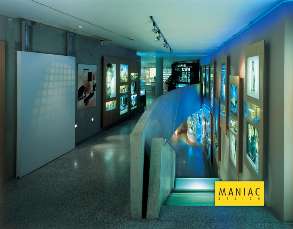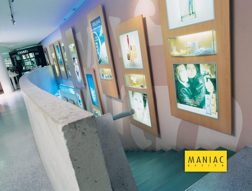 Návrh prodejních koutů respektujícíh Corporate image a Brand image jednotlivých kosmetických značek: Bvlgari, Salvatore Ferragamo, Juvena, Givenchy, Nina Rici, Chanel, La Praire a další. Realizace: Atelier S, Drkoš Interiéry, 1999